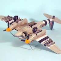 I gave the model several coats of clear flat varnish to get the final look I wanted. I then unmasked the canopy and attached the landing gear and propellers, finishing off with the Mark III rockets the kit provides.