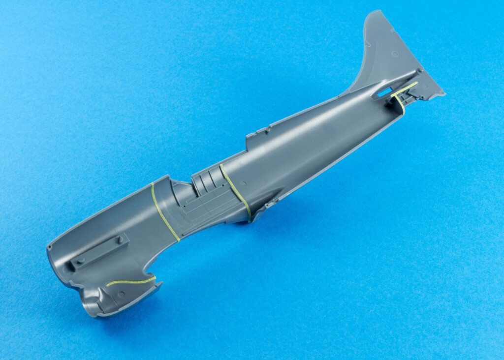 The solution provided by Eduard required the gluing seam to be filled. For this purpose, Vallejo Plastic Putty and Mr. Surfacer 500 were applied and polished to shape. Another area that required work was the wing to fuselage lower seam. A filing session and several rounds of filler and sandpaper eliminated the step present on the parts.
